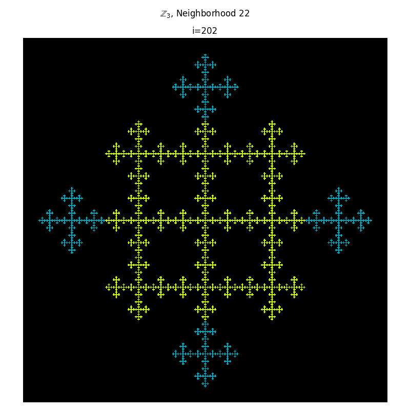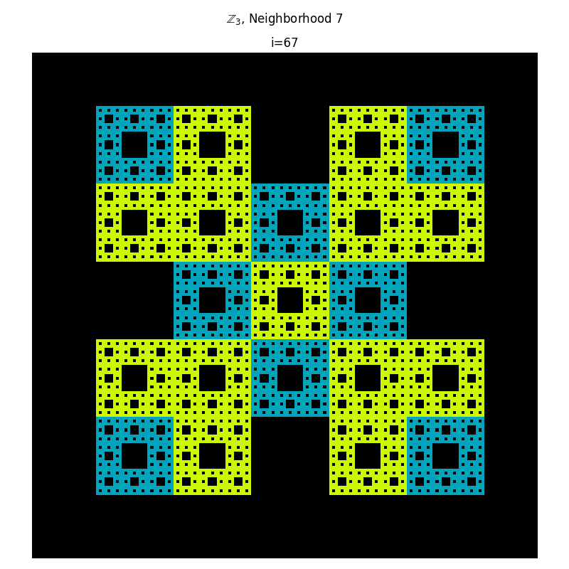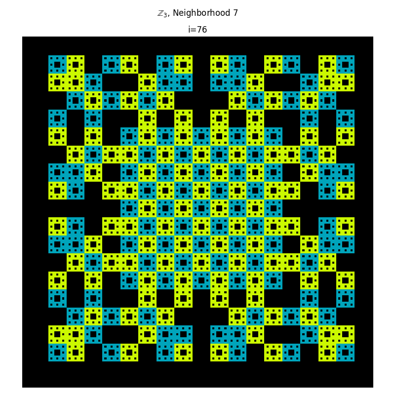 There is an interesting relationship here that I haven't explored very much yet. But consider the case where $m=3$ and $\vert N \vert$ = 9. So $n=\vert N \vert (m-1)= r(m-1) = 9(3-1) =18$ and the transition function is given by \[ \Delta : \mathbb{Z}_{18}\to \mathbb{Z}_3 \] The crucial thing here is $ 3 \vert 18 $. More generally, a function \[ \varphi: \mathbb{Z}_n \to \mathbb{Z}_m \] is a homormorphism if and only if $ m $ divides $n$. So This can be proved easily using the First Isomorphism Theorem. To find these homomorphisms, we only need to find parameters satisfying \[ r(m-1) = km \] where $k$ is some integer constant. Now consider what that equation is actually telling us. If $k$ and $\vert N \vert $ have no common divisors, then to construct $\Delta$, choose a neighborhood $N$ such that \[ r = lcm(m, m-1) \] Further refinements can be made depending on the initial cell states, e.g. accounting for initial states that are group generators. This is important because if the initial state does not contain a group generator, the only reachable states will be of integer multiples modulo $m$.
