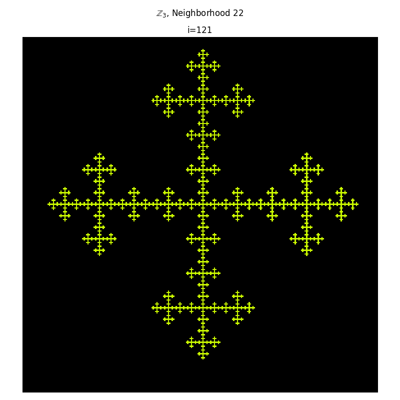 It also seems that we can construct many fractals that can be constructed from some string-rewriting methods. The below figures are constructed using a modulus of 3 with von-Neumann and Moore neighborhoods.