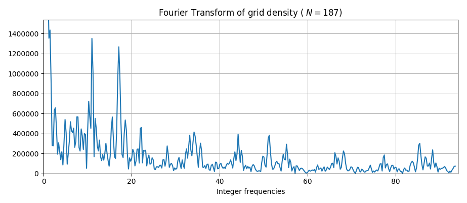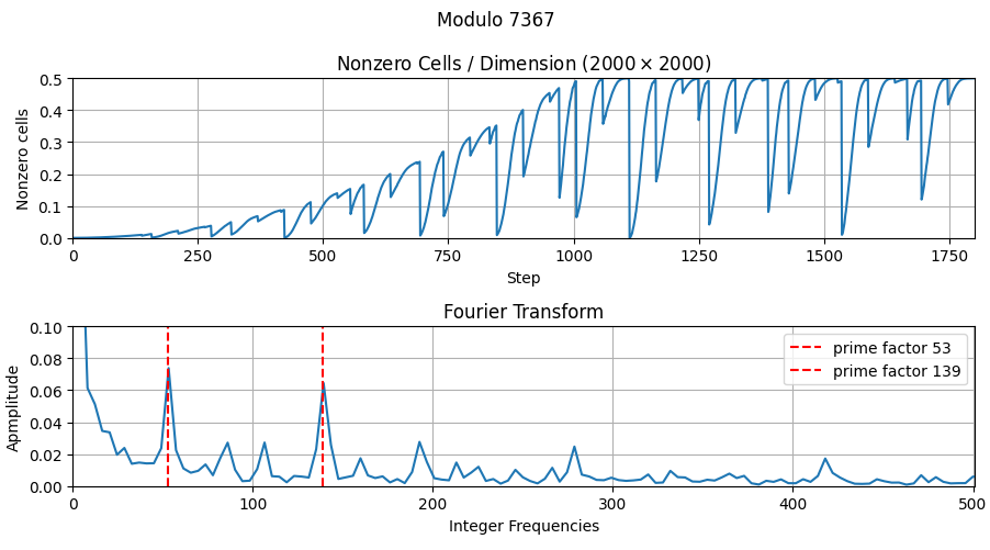 Using a simple example with $m=7367 = 53 \times 139$ define a neighborhood $N$ to be: \[ \begin{bmatrix} 1473 & 0 & 1473 \\ 0 & 1475 & 0 \\ 1473 & 0 & 1473 \end{bmatrix} \] whose entries sum up to $m=7367$. The grid size was $ 2000 \times 2000 $, At each step, the number of non-zero cells are recorded as a sequence. Applying a Fourier Transform over this sequence using a period of $m=7367$ an arbitrary initial state $a=24$ was chosen, and ran for ~1800 steps. shows peaks at its prime factors: 53 and 139.