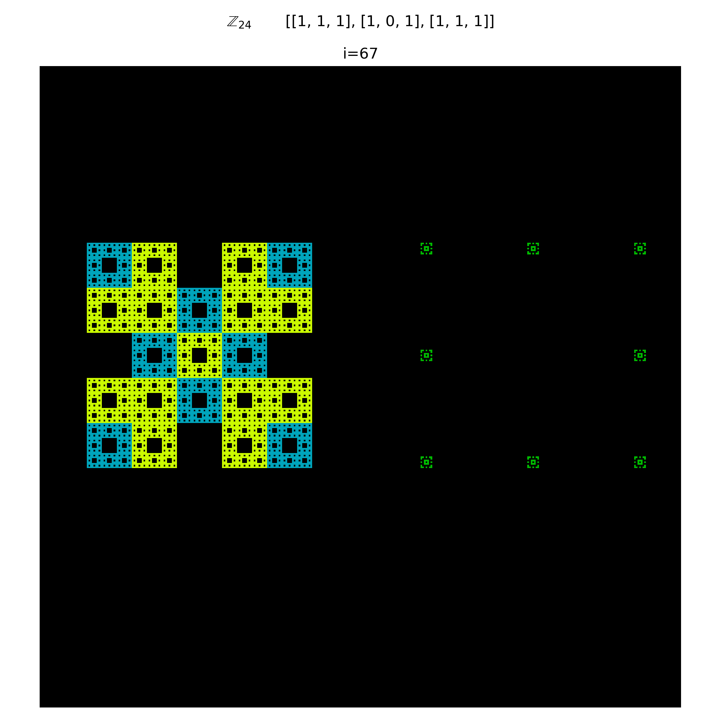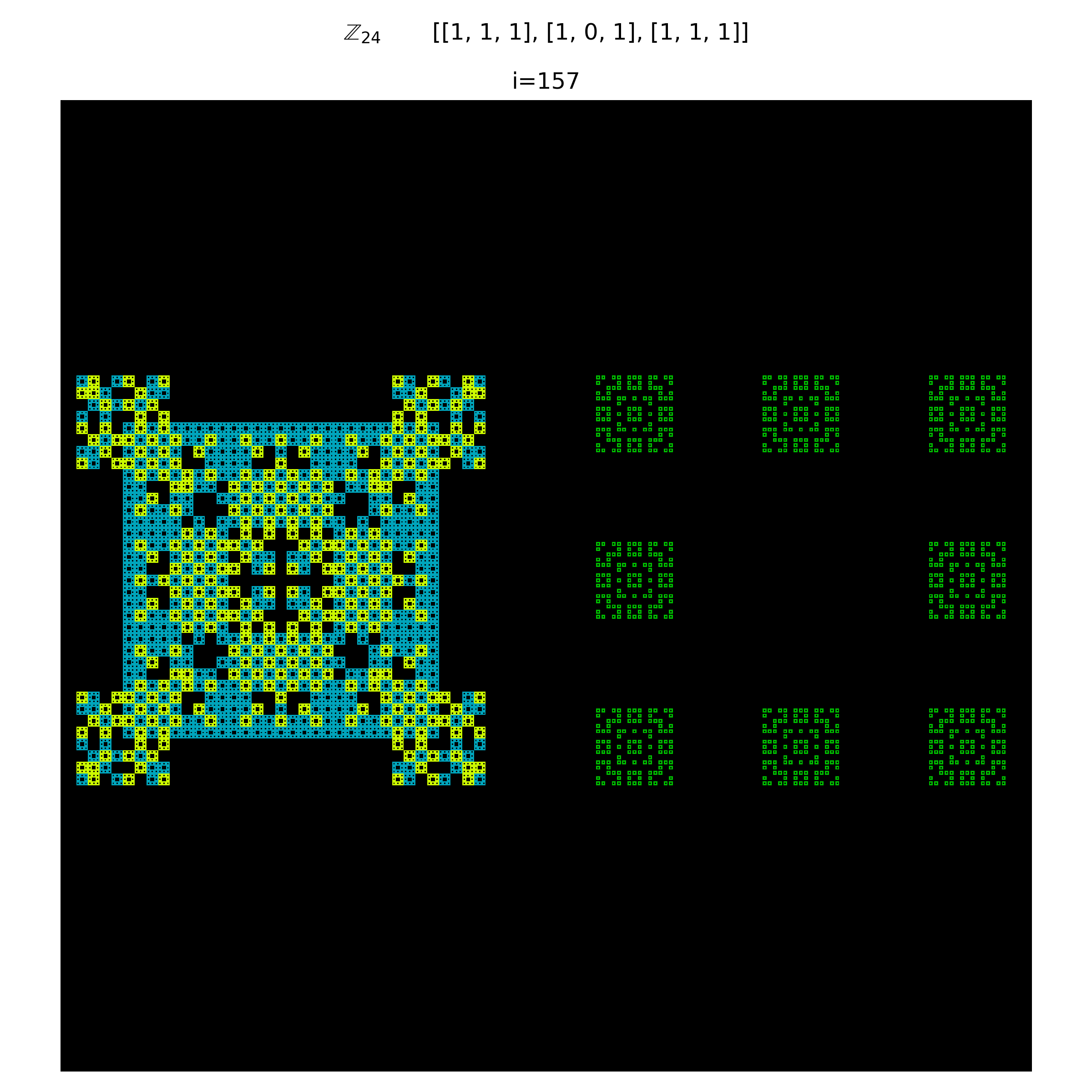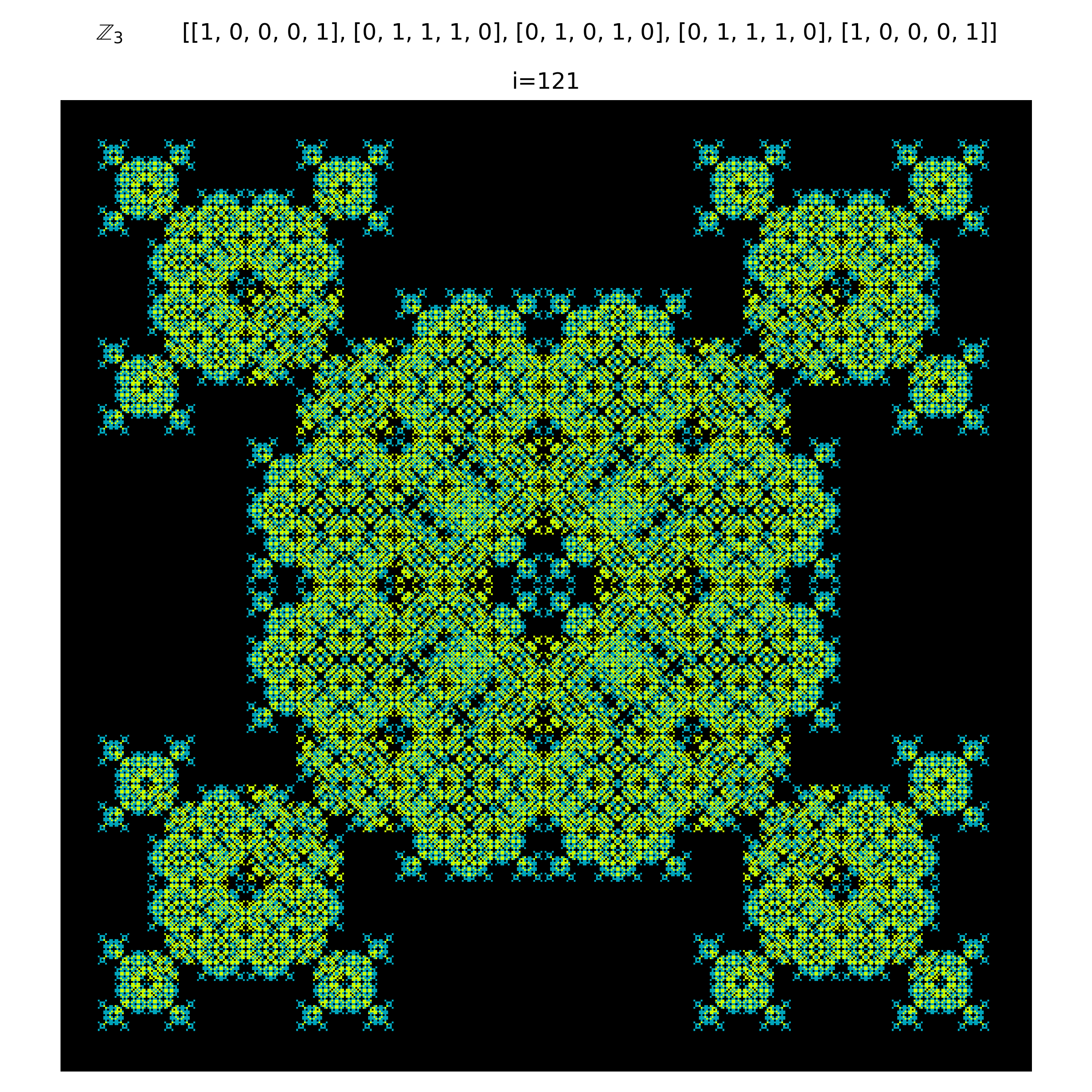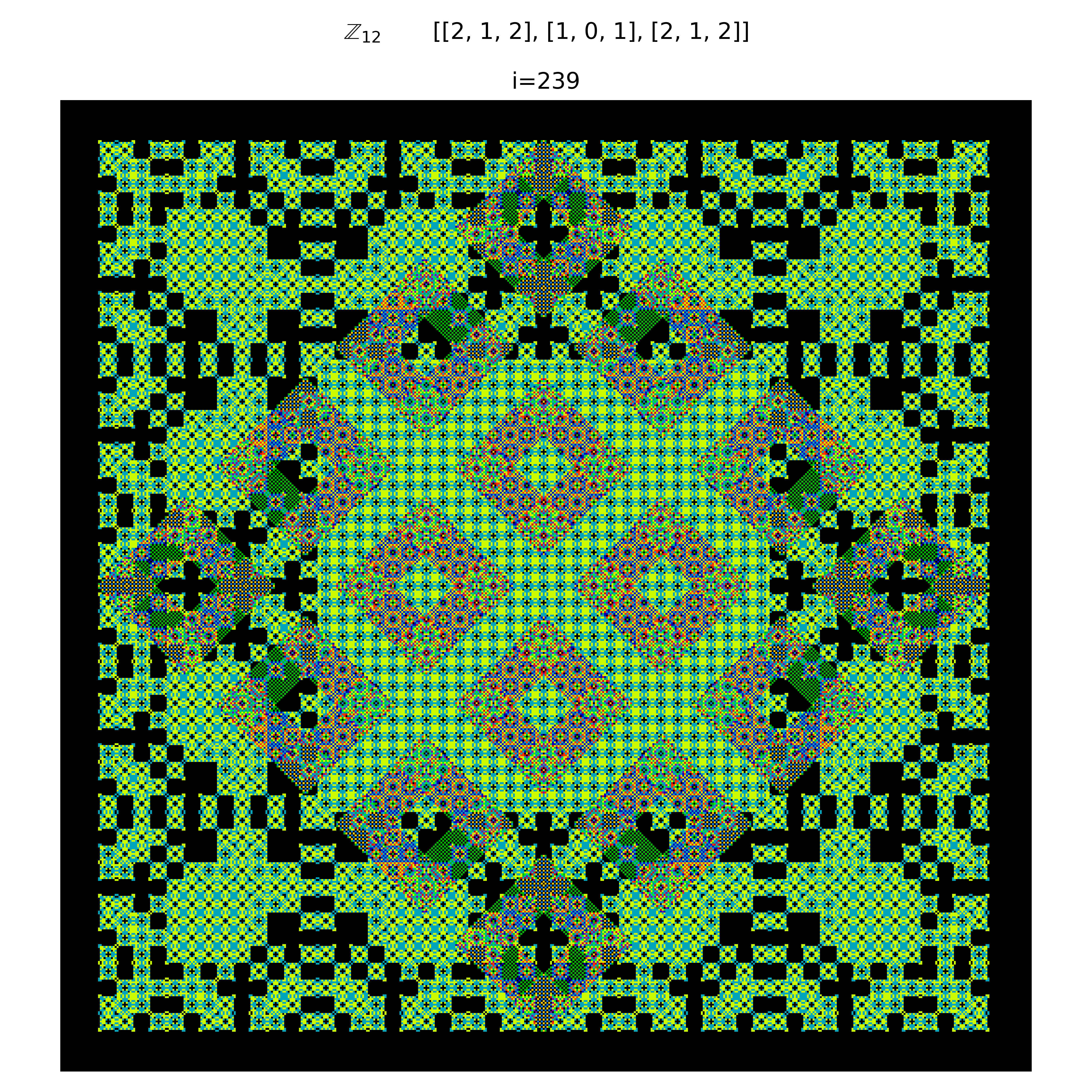 It is evident that using composite integers produce patterns that are compositions of their integer components. In a sense there are multiple distinct patterns embedded in the system. This becomes even more clear when using a transition matrix that is not limited to just values of $\{0,1\}$. More succinctly, weights can be applied to the matrix. As a result, distinct embeddings of other neighborhoods are clearly visible. The below figure shows a weighted Moore neighborhood. Residues from the von-Neumann neighborhood are still evident though.
