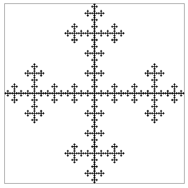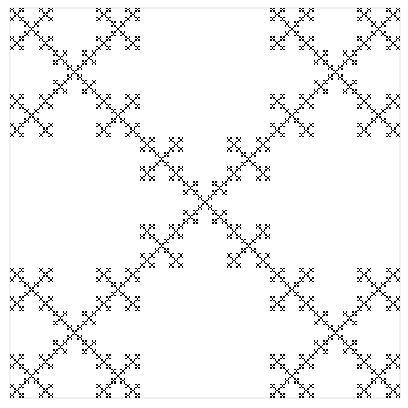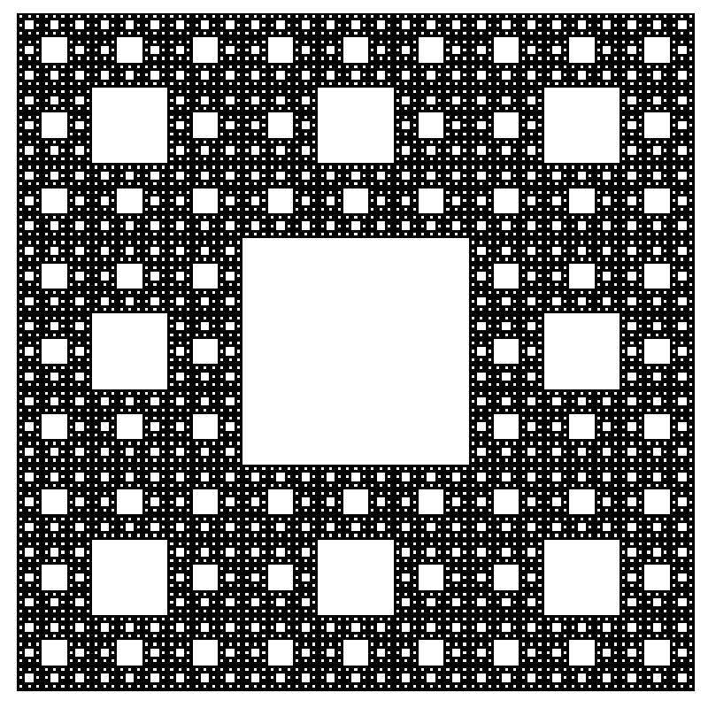 An interesting thing for many fractals has to do with the many ways of constructing them. One thing that I haven't quite noticed is that they're iteratively created using the Kronecker product. For example, the Sierpinski Carpet can be constructed analogously: